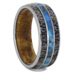 An array of complementing organic materials come together to form one idyllic union. This turquoise wedding ring set features some of most beautiful materials known to man. The men’s wedding band features turquoise that is showcased between two antler inlays. The women’s wedding band features a mesquite wood inlay paired with a vivid turquoise inlay and antler sleeve. These rings are sure to complement your love for years to come.