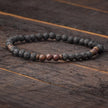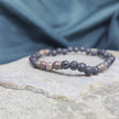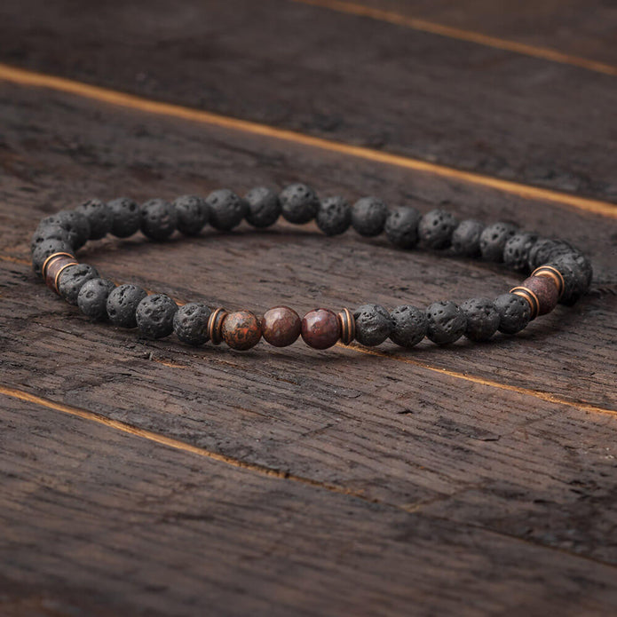 Our dinosaur bone bead bracelets are a must-have accessory that can be worn individually or stacked together. Every authentic gembone bead exhibits a unique color and pattern. The "Triton" has a group of three beads together with two other gembone beads equally spaced between lava beads on both sides.