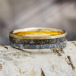 Beautiful Gibeon meteorite is paired with fossilized dinosaur bone in this wonderful 14k yellow gold wedding band. This men or women’s ring combines elements from space and earth to create a truly one-of-a-kind ring for that special someone.