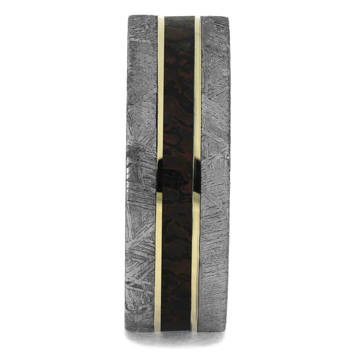 Two amazing natural materials are featured in this nontraditional men's wedding band. Genuine meteorite edges, a center pinstripe of solid, fossilized dinosaur bone and accents of 14k yellow gold. A unique wedding ring if you're looking for something unusual and gorgeous. The rare materials are millions and millions of years old. Think of the epic history that comes along with this alternative wedding band.