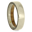 This handmade gemstone eternity ring has a half oak wood sleeve. Hidden within the sleeve is a secret yellow sapphire gemstone on one side, and the other side hides a pink sapphire. Celebrate your wedding anniversary with a distinct 14k white gold eternity ring to represent your true love.