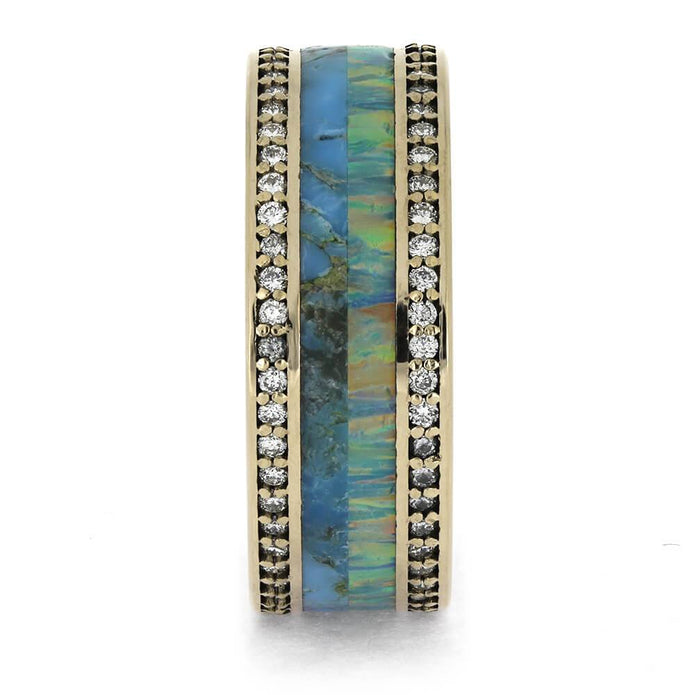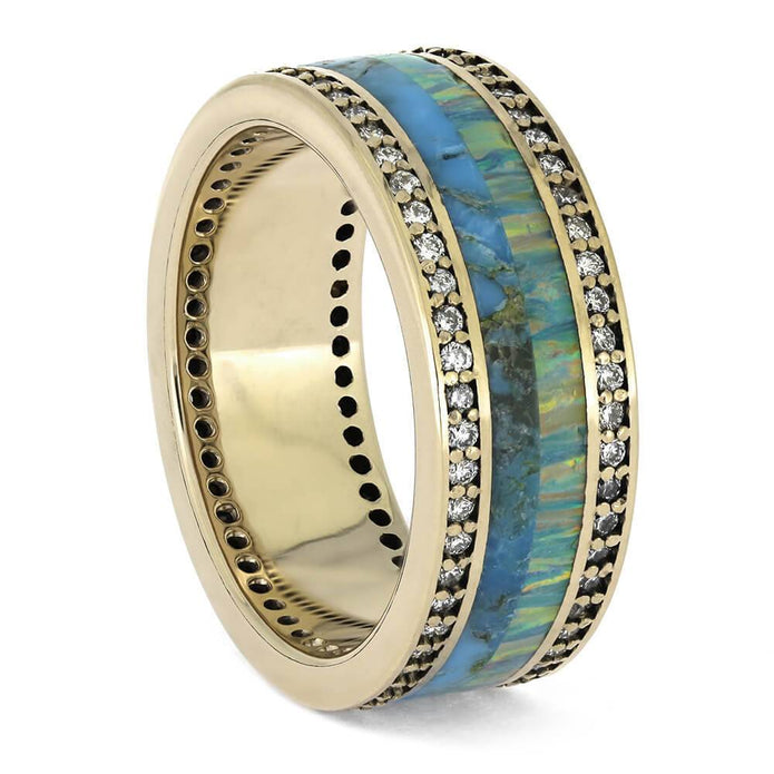 This 14k white gold wedding band features synthetic opal and Kingman blue turquoise, accented by two diamond eternity bands filled with natural diamonds. Perfect for weddings or anniversaries, it symbolizes timeless love. Customize this design or shop our other eternity bands for unique and sophisticated styles!