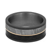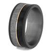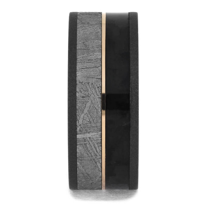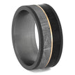 Gibeon meteorite and carbon fiber work together in this modern wedding band to give a masculine feel. With an added splash of color in the rose gold pinstripe, this ring is sure to wow everyone.