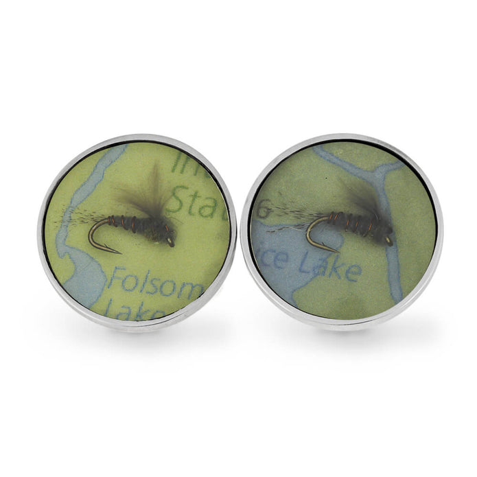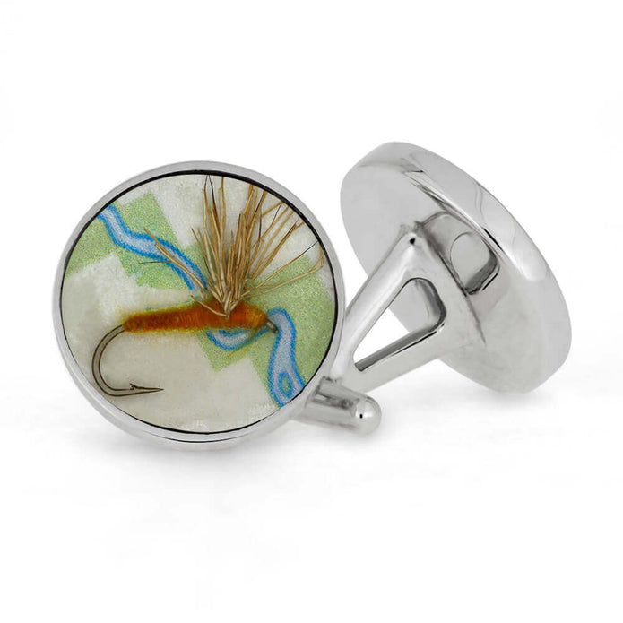 Show off your passion for fishing at even the most formal occasions with these fly fishing cuff links! These sterling silver accessories contain sections of a stream map and a real fly fishing lure in the bezel.