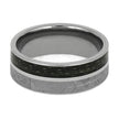 This titanium wedding band combines two unique natural elements, Gibeon Meteorite and green fishing line, to create a beautiful ring that pays homage to the outdoors. The Gibeon meteorite and fishing line are inlaid into the titanium, creating a pattern that is sure to draw attention.