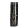 Memorialize your beloved pet or loved one by inlaying their ashes among stardust in this unique, memorial ring. The black stardust inlay combines pieces of meteorite mixed with ashes, both held securely in black enamel. This tungsten ring also features bold colors with its inlays of desert mosaic turquoise and genuine, fossilized dinosaur bone.