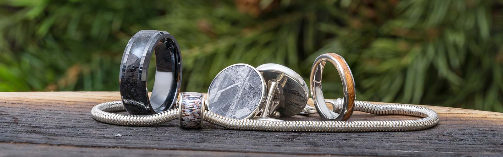 Jewelry by Johan's unique jewelry materials have symbolism that reaches every niche interest and special relationship. A meteorite ring or tie clip is a thoughtful choice for the dad who loves aerospace history or science; a dinosaur bone cuff link set can symbolize all the times he took you to the science museum.