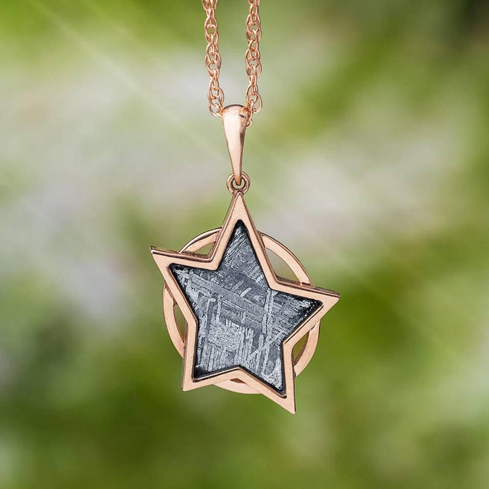 This meteorite pendant is a great anniversary gift for the star-gazer in your life. Polished rose gold frames the Gibeon meteorite star, bringing warm color to the space-themed pendant design.