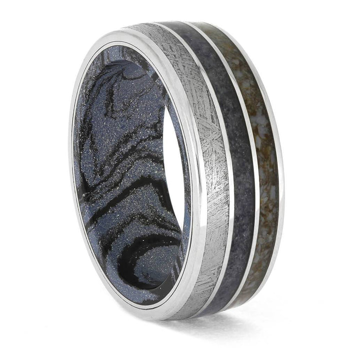 If blue is your favorite color, this ring is the one! Featuring a central inlay of crushed blue sapphires bordered by dinosaur bone and Gibeon meteorite, a blue mokume sleeve is the finishing touch.