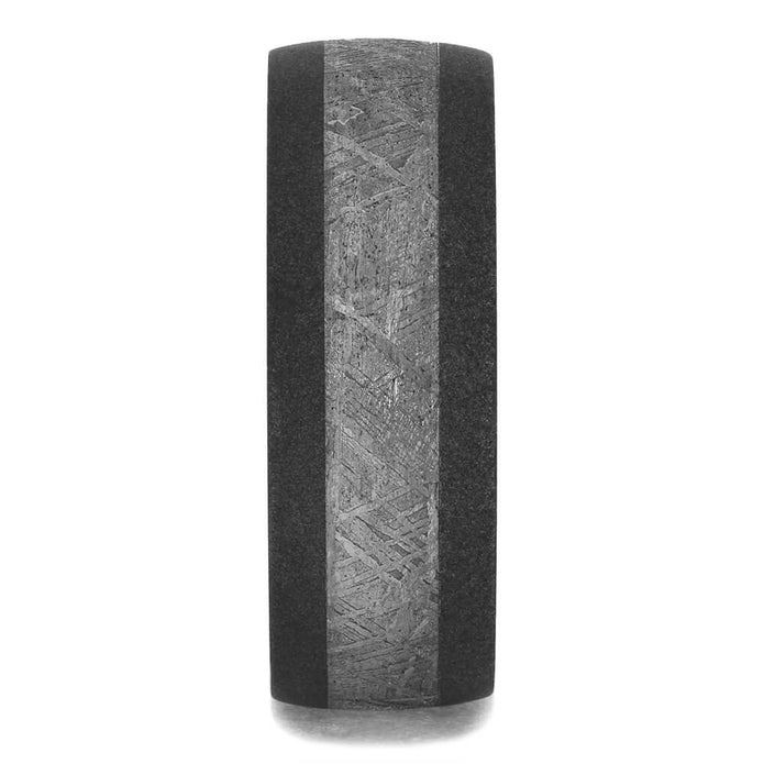 This genuine meteorite men's wedding band has a masculine, sandblasted finish that perfectly complements the metallic pattern in the space rock inlaid up the center. Hidden inside, our swirling mokume gane composite.