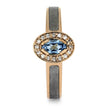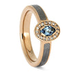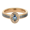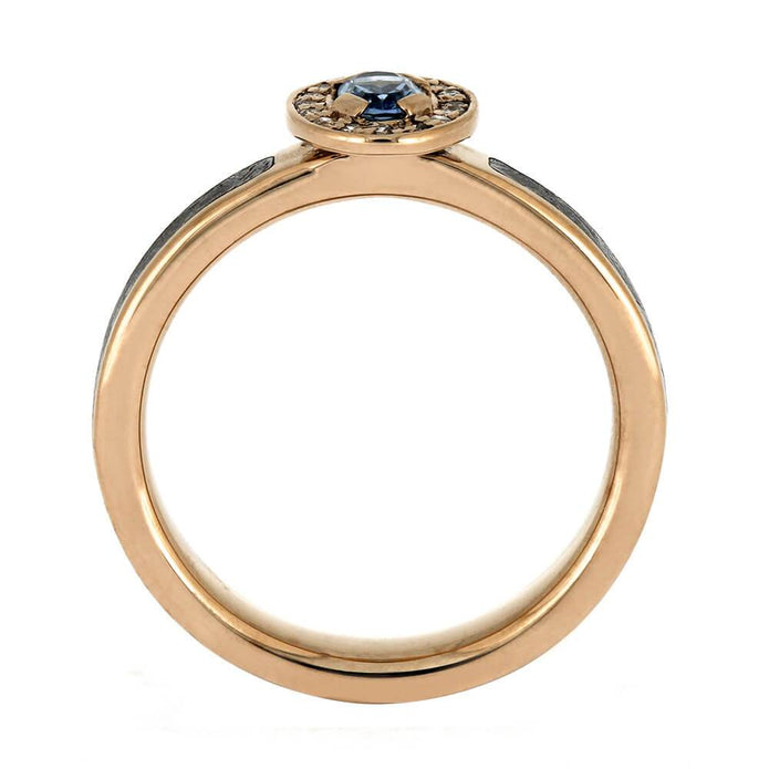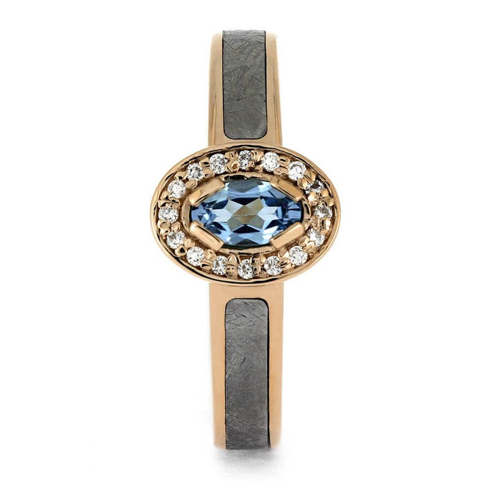 This 14k rose gold engagement ring features a stunning oval halo of diamonds and blue topaz, enhanced by a striking Gibeon meteorite band. Add a touch of outer space to your jewelry collection with this extraordinary meteorite engagement ring.