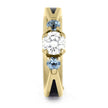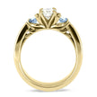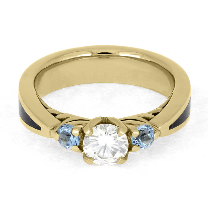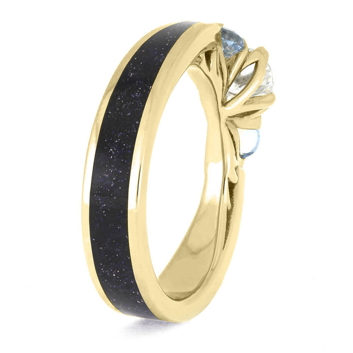 This ring features a classic three stone design, incorporating moissanite and topaz gems, with a striking inlay of blue goldstone set in 14k yellow gold. Its celestial appearance is perfect for individuals interested in astrology, astronomy, or stargazing, making it a meaningful symbol of your partnership.