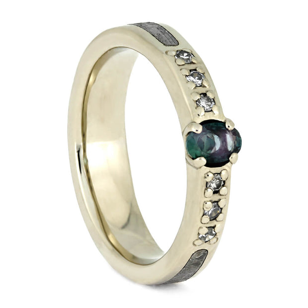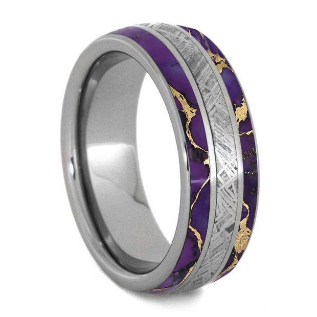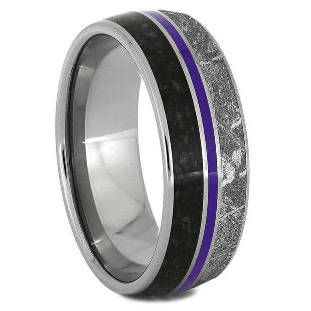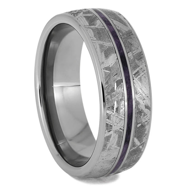 Make a bold, vivid statement with Jewelry by Johan's purple meteorite wedding rings! Choose a meteorite ring with violet accents if you're a scientist, tech enthusiast, or just love the idea of wearing a piece of the cosmos. These rings are handmade in the USA with Gibeon meteorite and a purple material, such as dyed box elder burl wood, purple Stardust, Gem Alloy, or a purple gemstone like amethyst or alexandrite. Explore our extensive collection of custom meteorite wedding rings that offer both classical and modern styles - all from outer space.