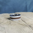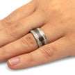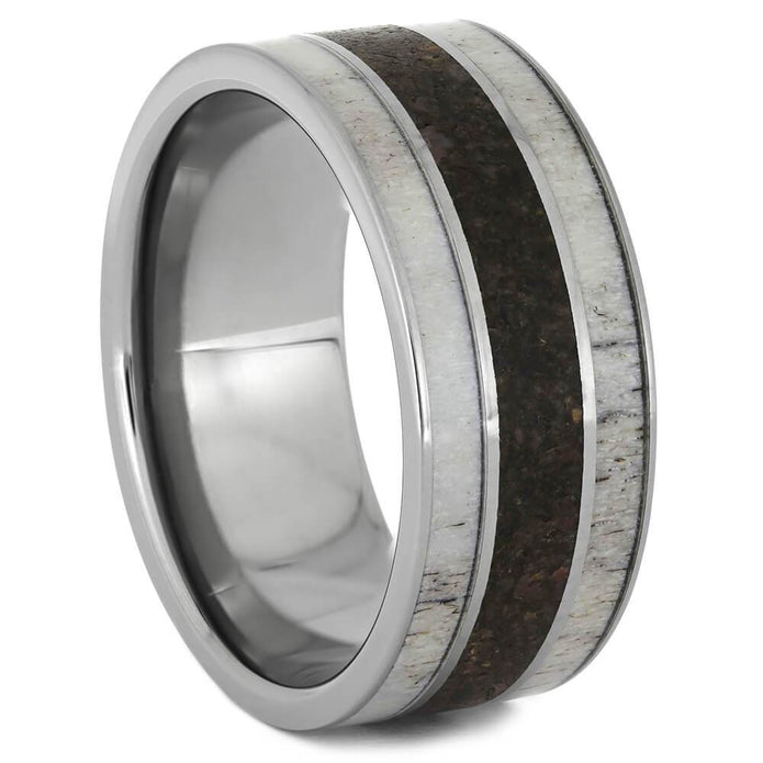 Dark dinosaur bone and deer antler inlays decorate this masculine fossil ring. Outdoors enthusiasts are sure to appreciate the colors and textures in the naturally-shed deer antler, which compliments the polished titanium pinstripes. Show off a nature-inspired style with this rugged titanium wedding band!