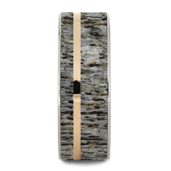 This titanium wedding band has a deer antler overlay accented with a 14k rose gold pinstripe. Deer antler rings are a great way to express your love for hunting and the great outdoors.