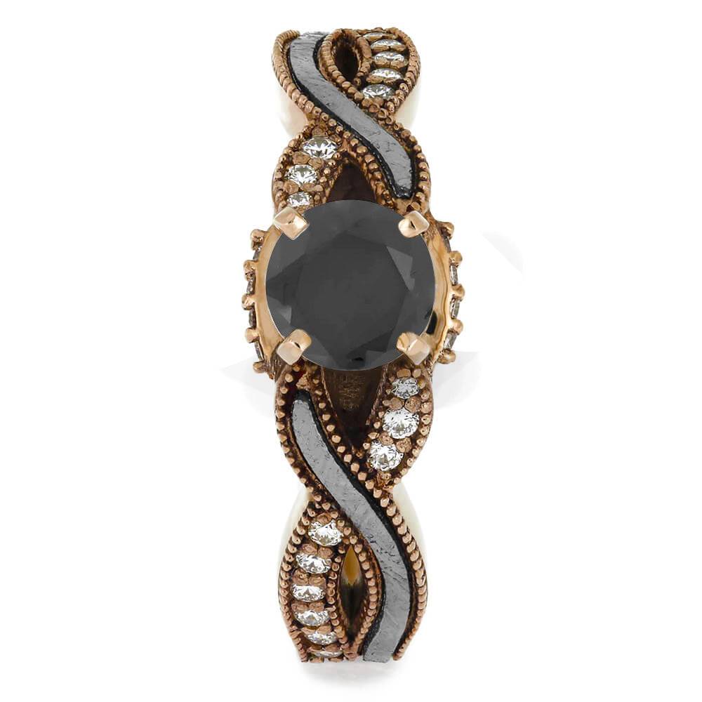 This stunning, alternative engagement ring features a black diamond center stone. Dazzling diamonds and partial inlays of Gibeon Meteorite intersect as they twist along the surface accented with a milgrain texture. Crafted in solid rose gold, this engagement ring will have her in shock and awe.