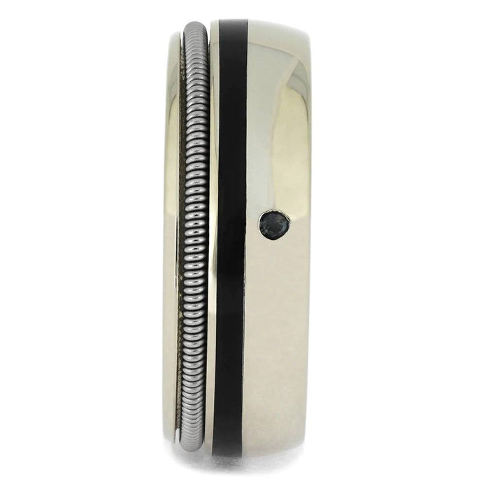Celebrate your love of music with a guitar string wedding band! A green sapphire stone is flush set into polished gold, bringing a splash of color to the black ebony wood design. Wear your hobby in a tasteful guitar string ring, perfect for the musician bride or groom!