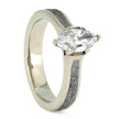 This 14k white gold marquise engagement ring combines unique materials and classical styling for a sophisticated look that's out of this world. Gibeon meteorite lines the inlay of the band, providing a sparkling accent to the glistening marquise-cut center stone. This meteorite solitaire is an excellent way to include an exotic material in a ring while maintaining a more traditional design.