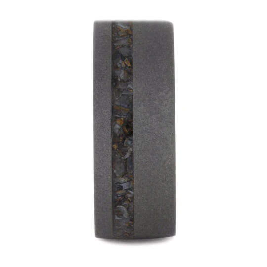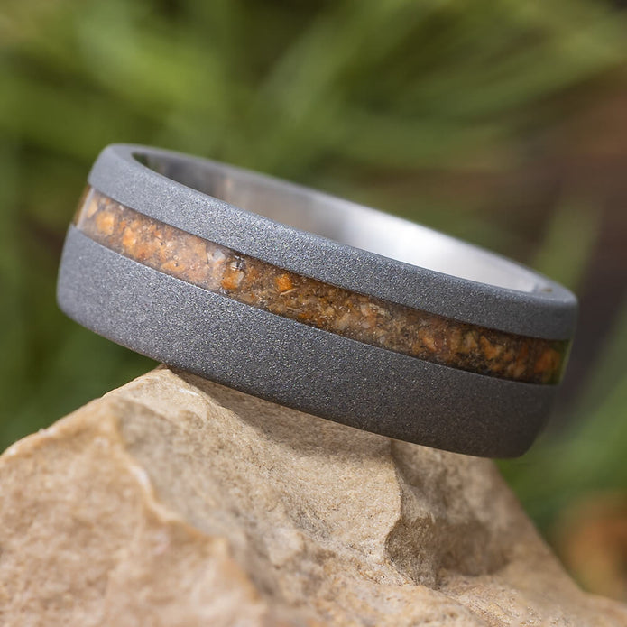 Bring back the Jurassic Age with this dinosaur bone wedding band. The sandblasted titanium ring has a rough texture and look, perfect for your rugged lifestyle. Sure to draw attention with its natural, one-of-a-kind pattern this fossil ring is a great gift for someone special in your life.