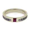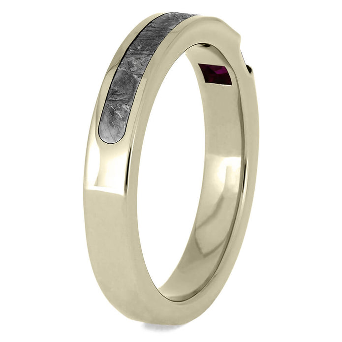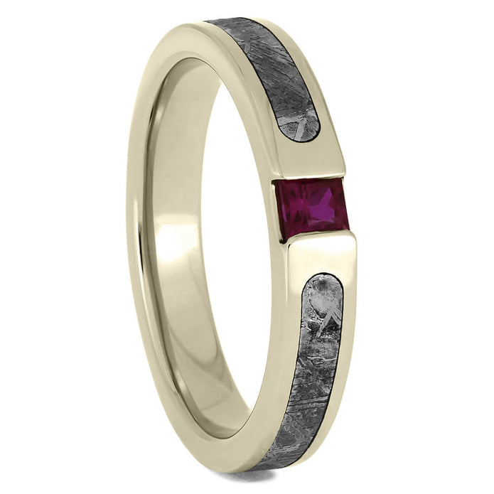 Celebrate your special love with this special meteorite engagement ring. This white gold ring is flush set with a terrific red ruby center stone. Partial meteorite inlays flank the sides of the flush set gem. Being over four billion years old this meteorite has truly stood the test of time, as with your enduring relationship. Here is a spectacular engagement ring with beauty to spare.