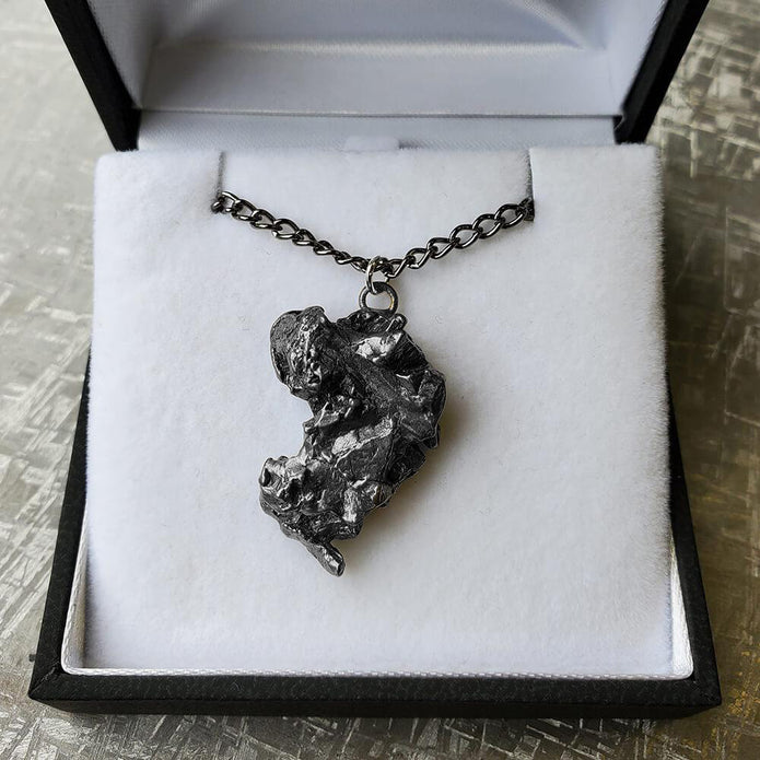 Add a stellar twist to your style with this long meteorite necklace! This men's or women’s sterling silver pendant holds a small chunk of campo del cielo meteorite and is strung on a 30" gunmetal black chain.
