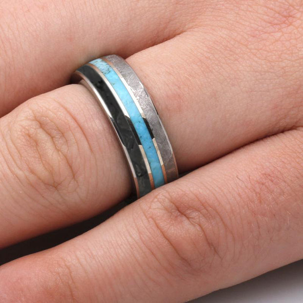 Mokume meteorite wedding bands combine the simplistic beauty of meteorite with the captivating, swirling pattern of mokume gane. Cobaltium mokume has a dark and light blue pattern that pairs well with meteorite's silver tone. Any of our mokume gane choices compliment meteorite and we have a variety of color and style options.