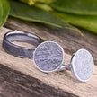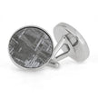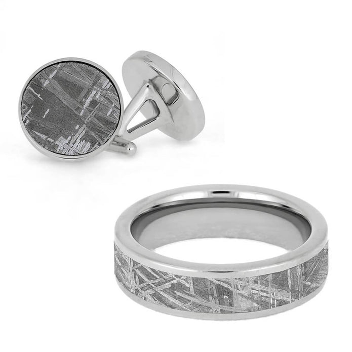 A simple, but stunning authentic meteorite wedding band crafted with titanium sleeve with coordinating meteorite cuff links. Give the gift of the galaxy with this Gibeon meteorite jewelry set.
