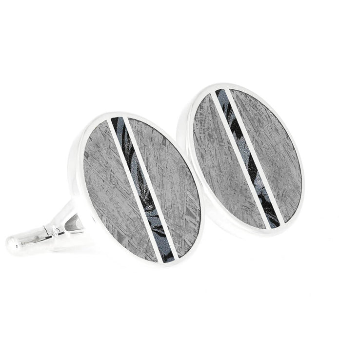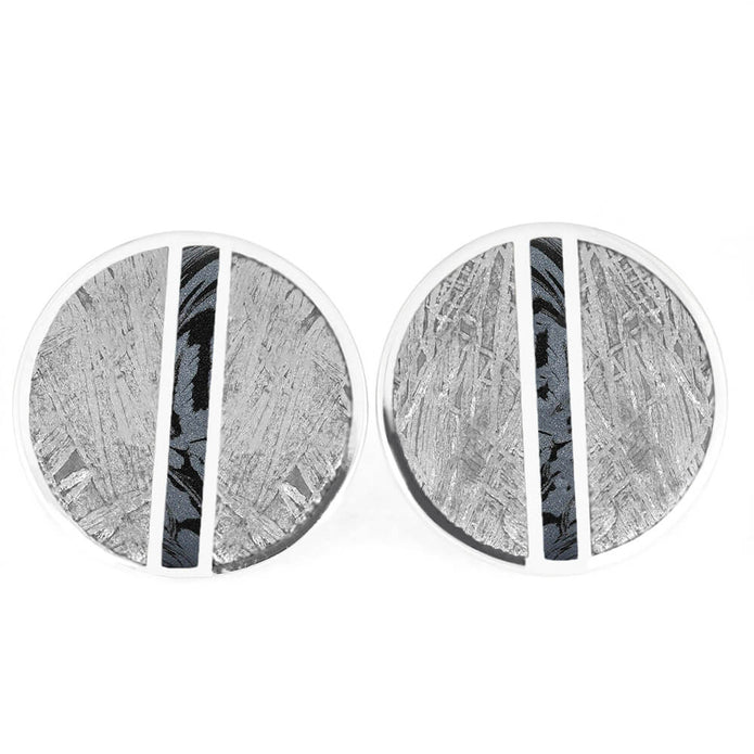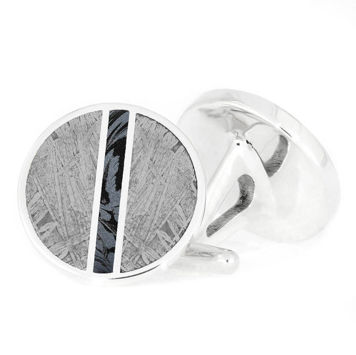 These sterling silver cuff links bring together the swirling colors of cobaltium mokume and etched meteorite. The muted colors let these men's cuff links match most suits.