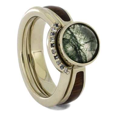Moss Agate is frequently used in men's and women's rings, with its organic patterns often paired with woods, antlers, or meteorite for a one-of-a-kind look. It is also popular for engagement rings and wedding bands, especially for those seeking an alternative to traditional gemstones. The stunning green inclusions offer a natural yet luxurious appeal that pairs beautifully with titanium, gold, or platinum.