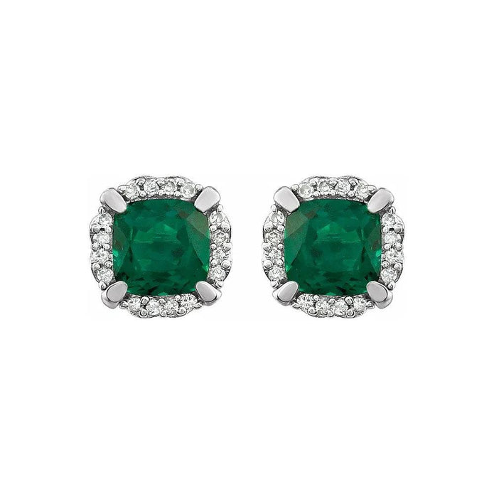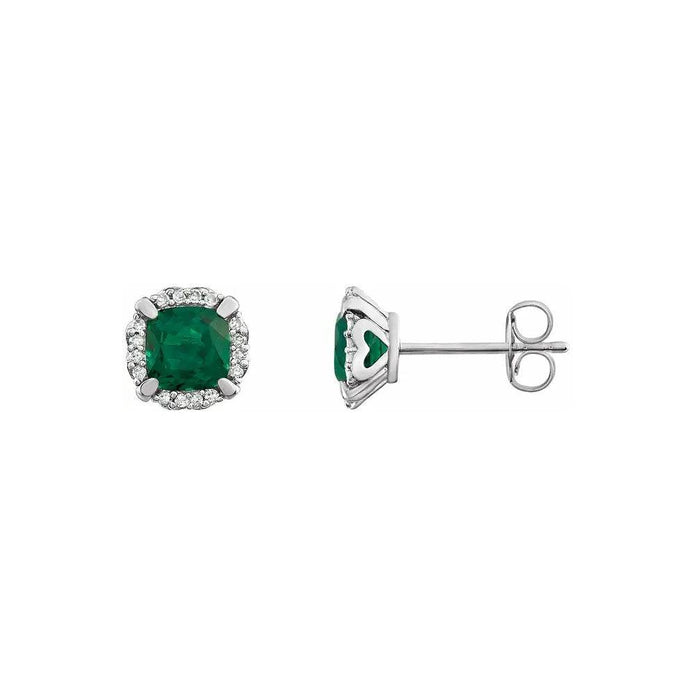 Glistening green emeralds are the featured stone in these halo set stud earrings. Dazzling diamonds frame each of the cushion cut stones. Crafted in timelessly styled, high quality, 14k white gold. Customize these earrings to feature a different cushion cut stone of your choice.