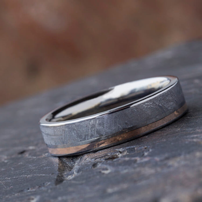 This classic meteorite and spectacular 14k rose gold ring will melt your heart. Distinctive patterns in meteorite give each piece character and beauty. The meteorite and rose gold inlays are further enhanced by gleaming titanium pinstripes. This ring will make a truly extraordinary statement and a beautiful gift.