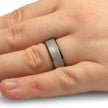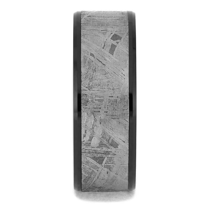 This men's wedding band features an inlay of authentic Gibeon meteorite. It is crafted in polished, masculine black ceramic. Its thin, beveled edges give it a simple style and contrast the silver sheen of the billion year old space rock.