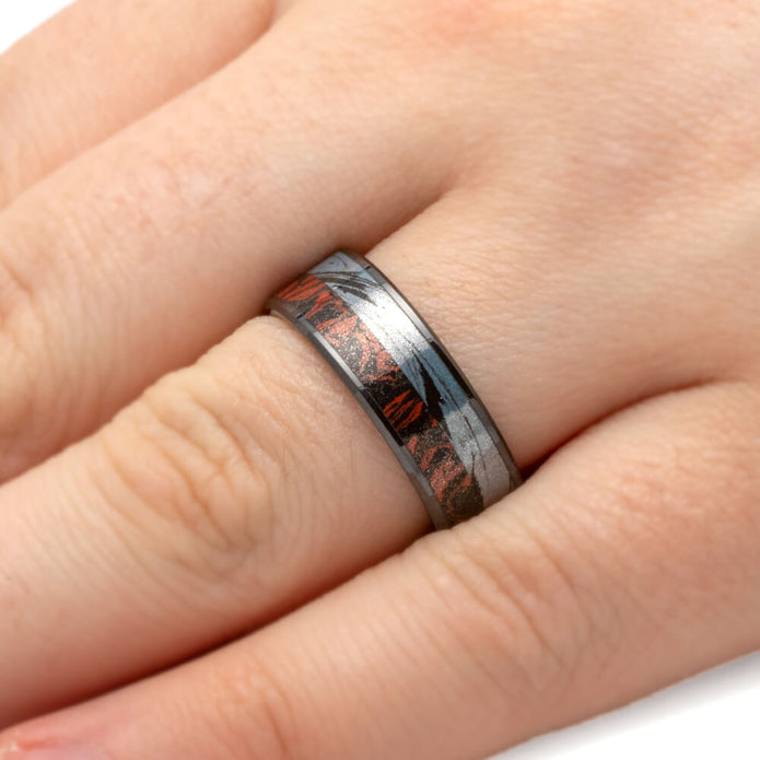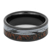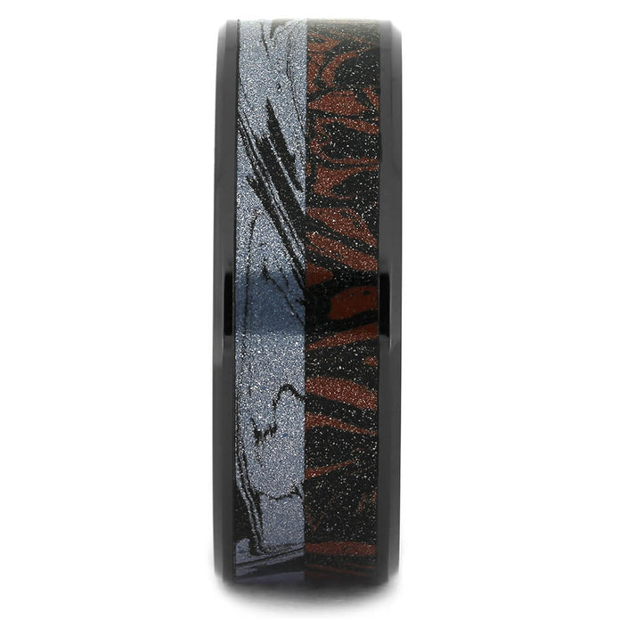 This black ceramic ring has two different colors of mokume side by side. Both pair well with the black ceramic sleeve, making the ring feel dark and mysterious. Mokume gane is a rare metal lamination process was developed in the 17th century for the adornment of Samurai swords.