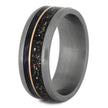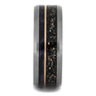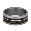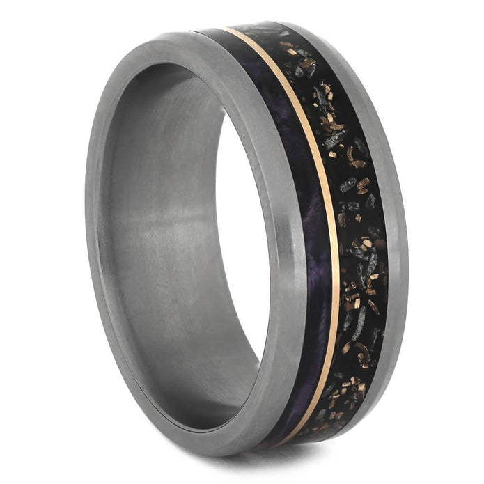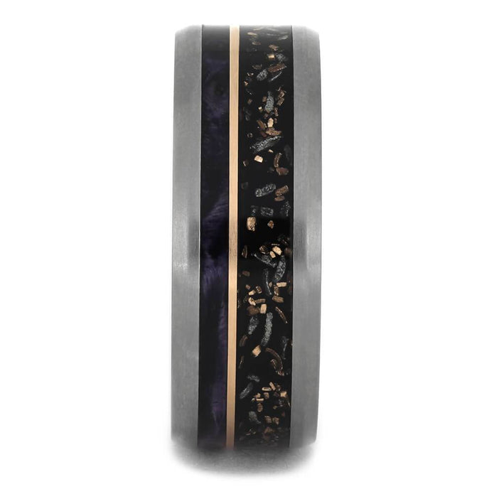 This titanium wedding features an inlay of purple box elder burl wood, black stardust with rose gold flakes, and is separated by a 14k rose gold pinstripe.