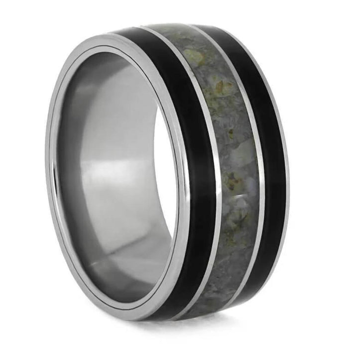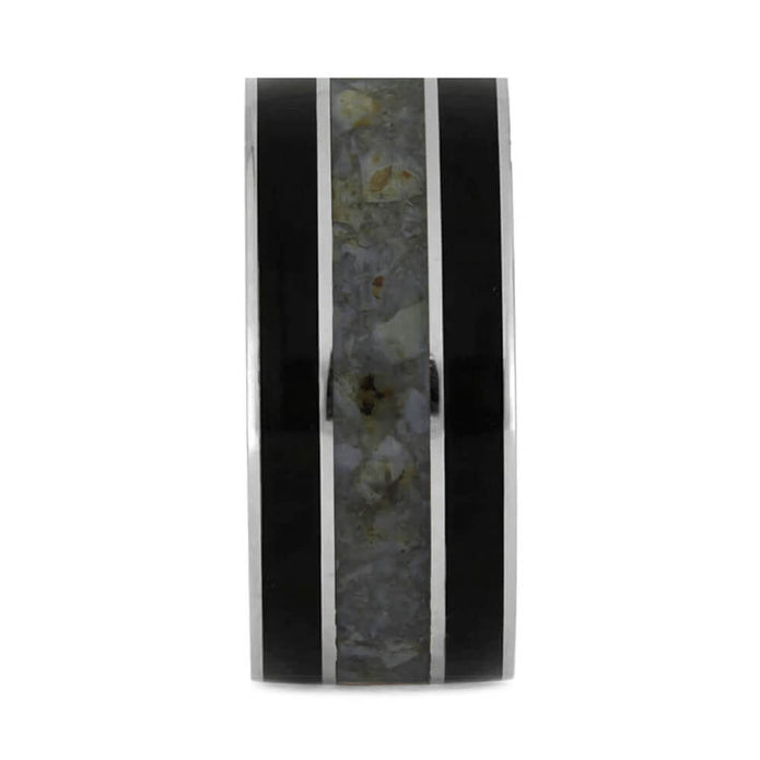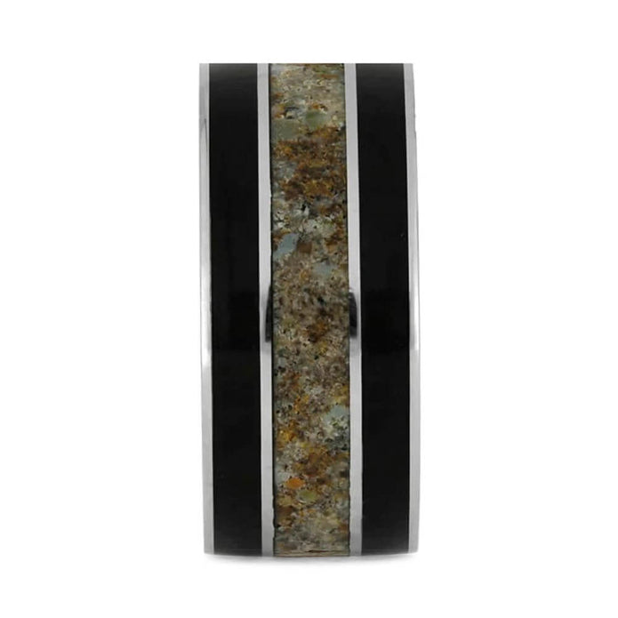 Genuine dinosaur bone decorates the borders of this blackwood wedding band. Set in polished titanium, each exotic inlay is protected by a crisp metal pinstripe for added durability and contrast. Give this colorful wedding band to that special someone to show off your love of nature!