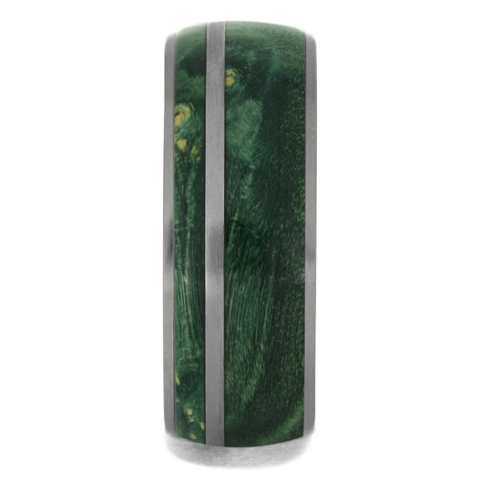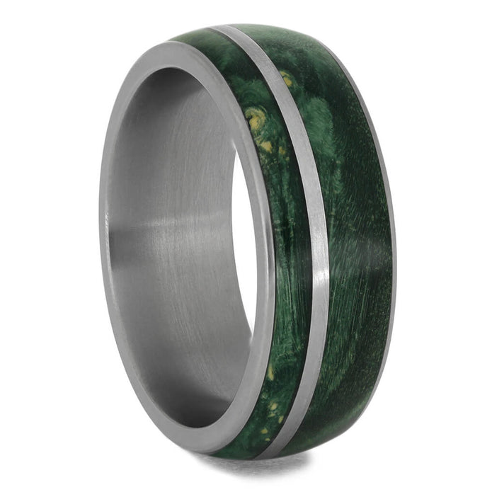 Green Box Elder Burl Wood Ring with Titanium Pinstripe