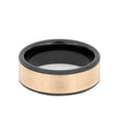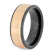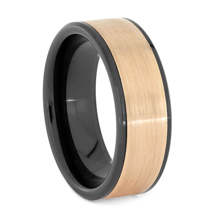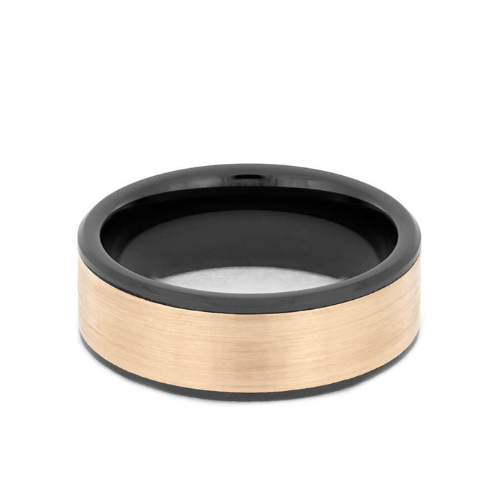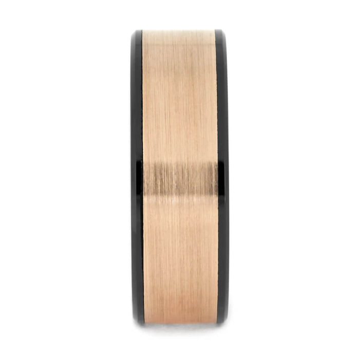 This beautiful polished black ceramic wedding band is complemented by a splash of color with the 14k rose gold inlay. The brushed finish on the rose gold allows it to add a sleek texture and style, without it overpowering the black ceramic band.