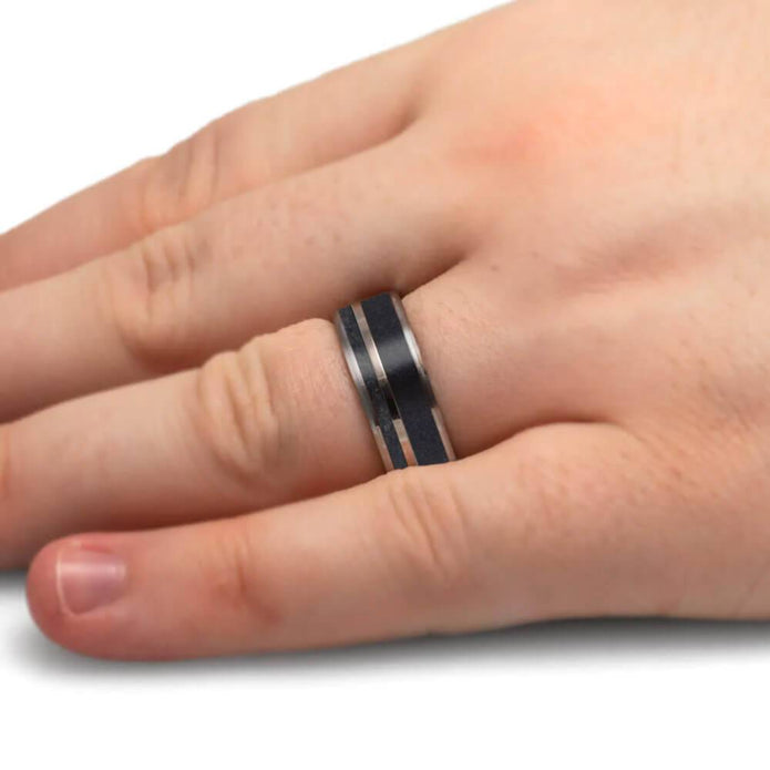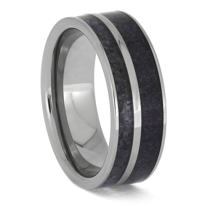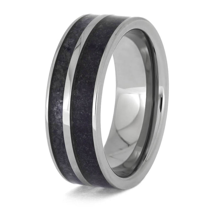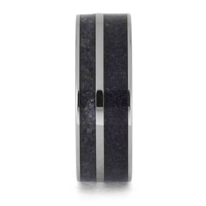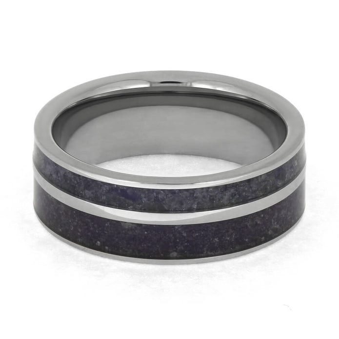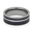 This men's wedding band is adorned with crushed amethyst and crushed tanzanite birthstones, adding a colorful and meaningful twist. The titanium edges give a rugged aesthetic to this one-of-a-kind band, while our Ring Armor Waterproofing coating ensures its durability and longevity.