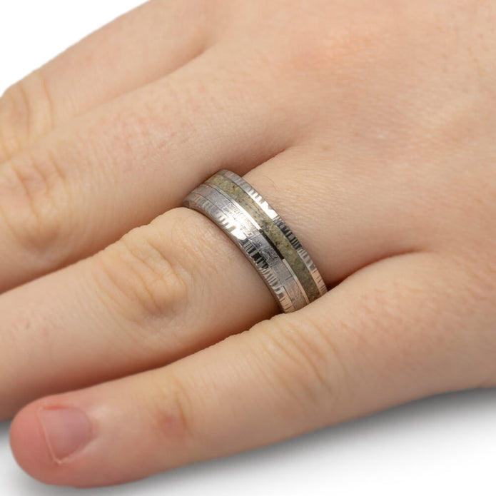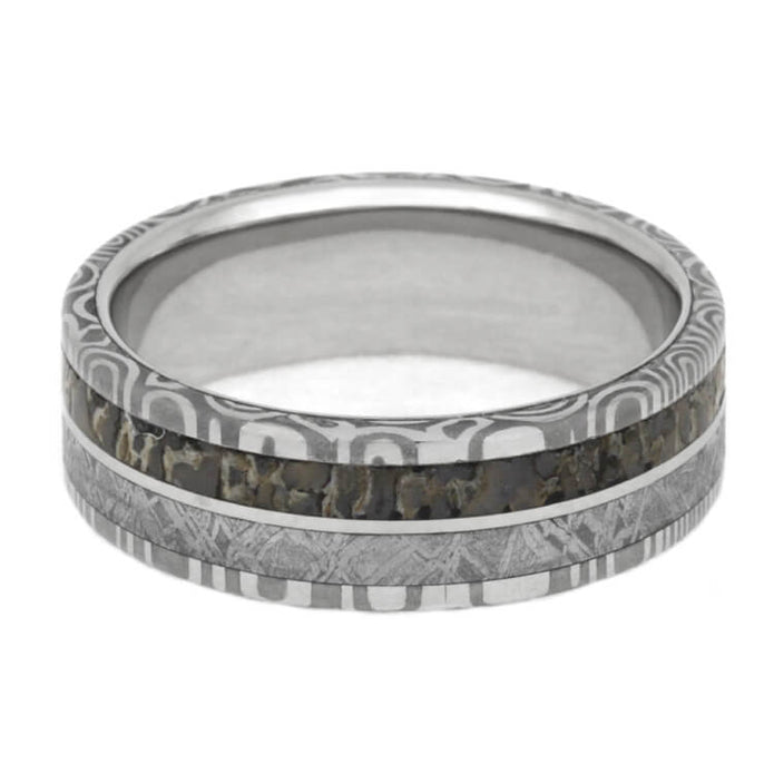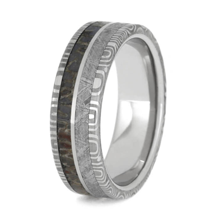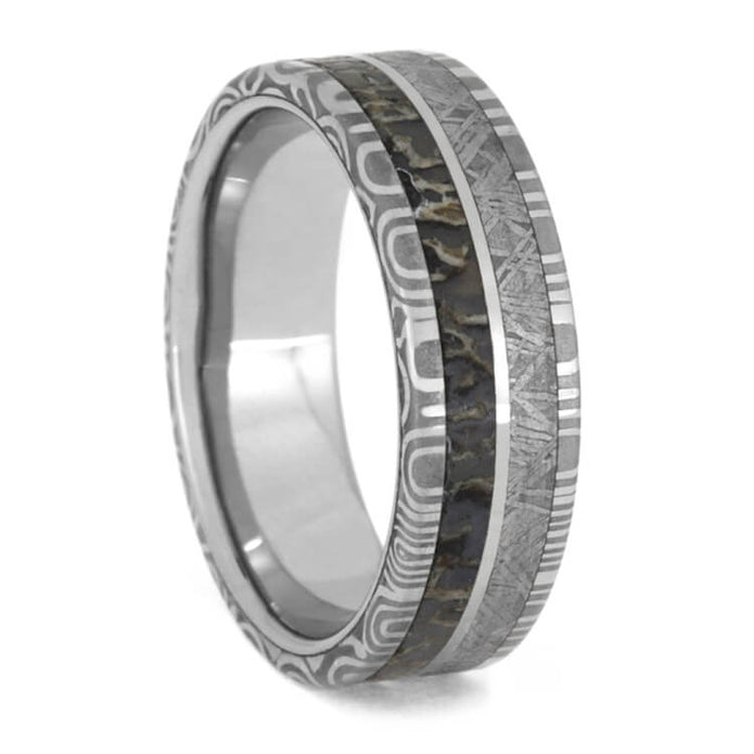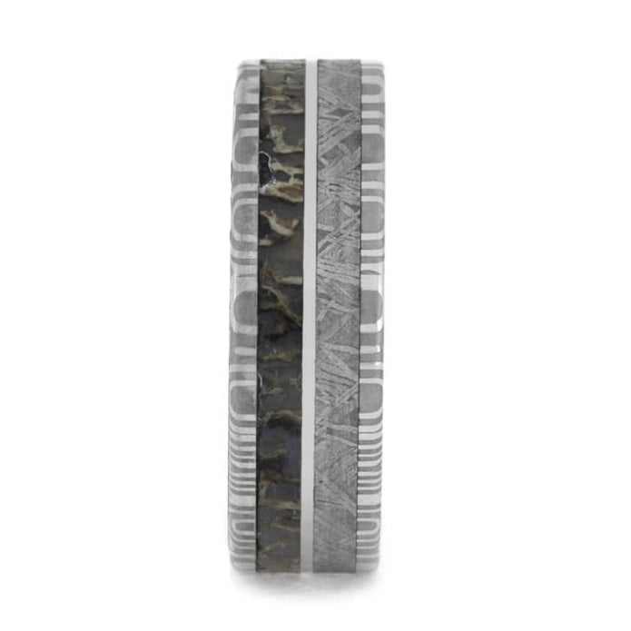Materials in Meteorite & Dinosaur Bone Wedding Band With Damascus Steel