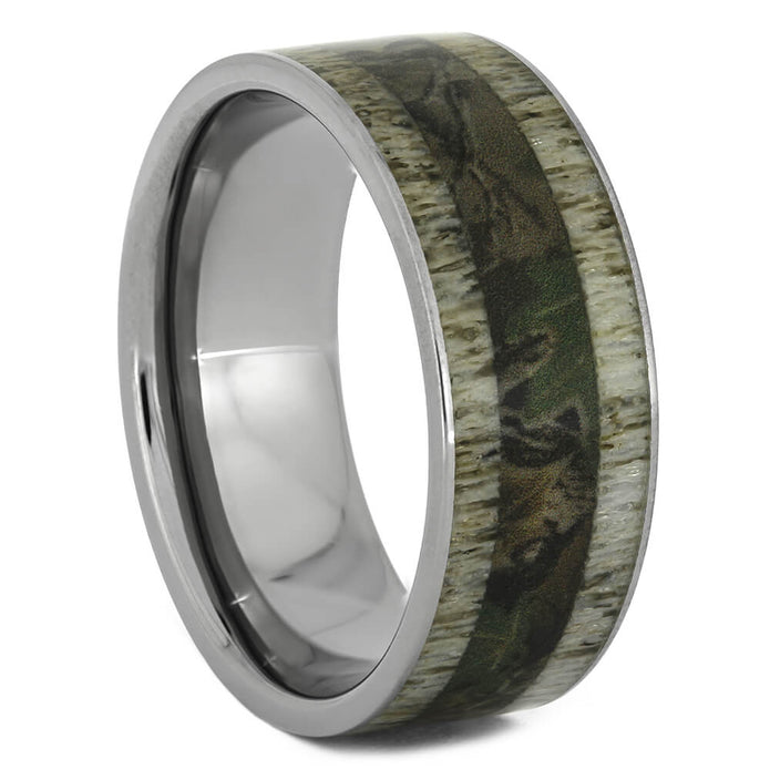 This men's wedding band is the perfect gift for any hunter. Between two solid deer antler pieces is a camouflage print inlay, bringing both color and personality to this unique men's ring.