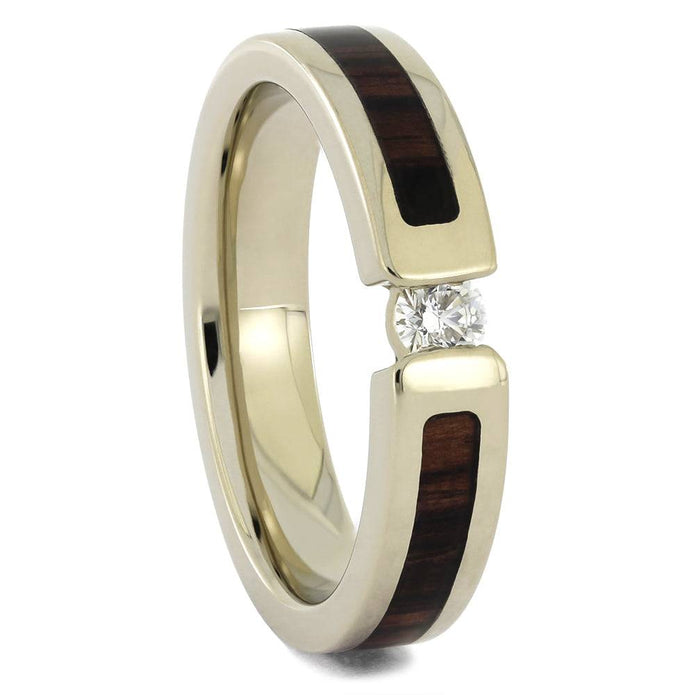 Pop the question to your queen with this king wood diamond ring! This handmade white gold wedding ring is inlaid with rich, natural king wood and is adorned with a faux-tension-set diamond.