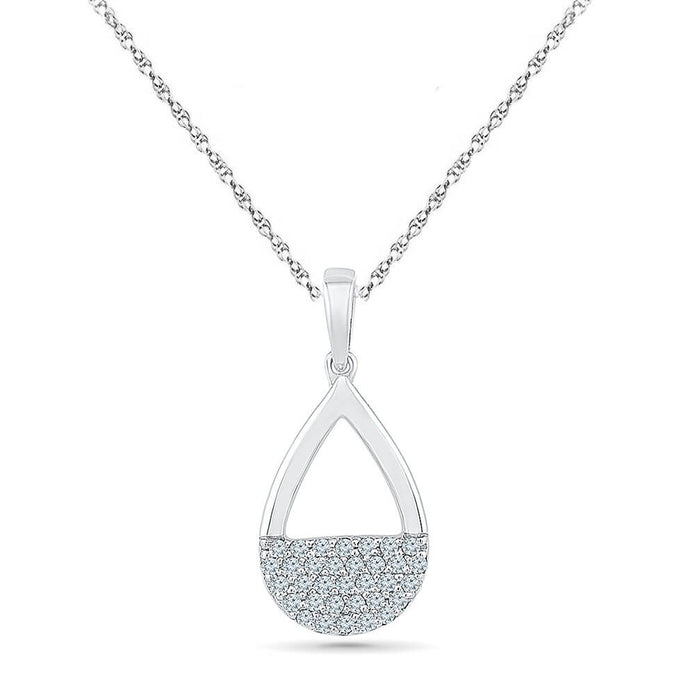 This teardrop pendant features a diamond cluster design on an 18 inch rope chain. This women's diamond necklace is offered in sterling silver or gold in your choice of rose, white or yellow.
