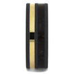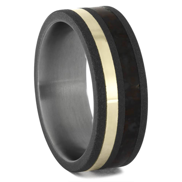A masculine and unique men's wedding band choice featuring an inlay of genuine, fossilized dinosaur bone, also known as gembone, accented with a polished pinstripe of gold. The ring's titanium edges are sandblasted for a dark contrast.