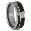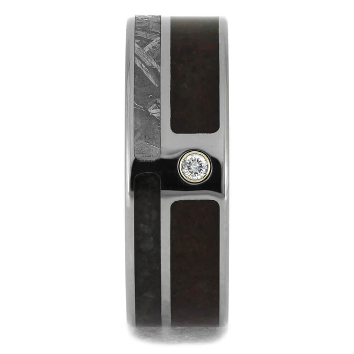 This incredible, unique men's wedding band features a trio of natural materials and a sparkling diamond. Authentic meteorite, genuine, fossilized dinosaur bone and petrified wood. A masculine ring option for any groom or gent looking for an alternative, everyday ring.