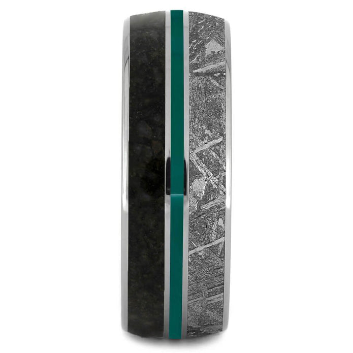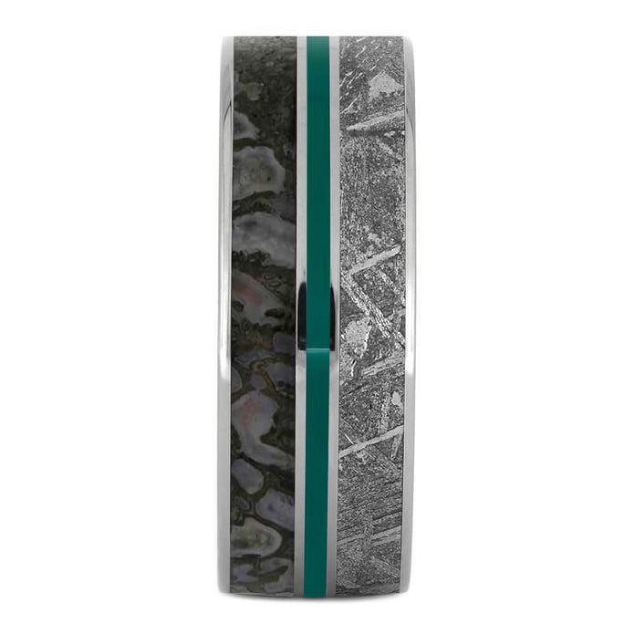 Make a statement with this dinosaur bone wedding band. This ring is also inlaid with real Gibeon meteorite and accented with a green enamel center pinstripe. The unique materials used in this men’s titanium ring comes with patterns that is distinct in every piece.