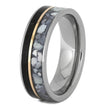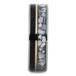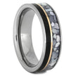 Bring some subtle color and unique style to your men's wedding band with dinosaur bone. On one side of the rose gold pinstripe is crushed dinosaur bone and on the other side are pieces of mother of pearl, bringing unique texture to your handmade wedding band.