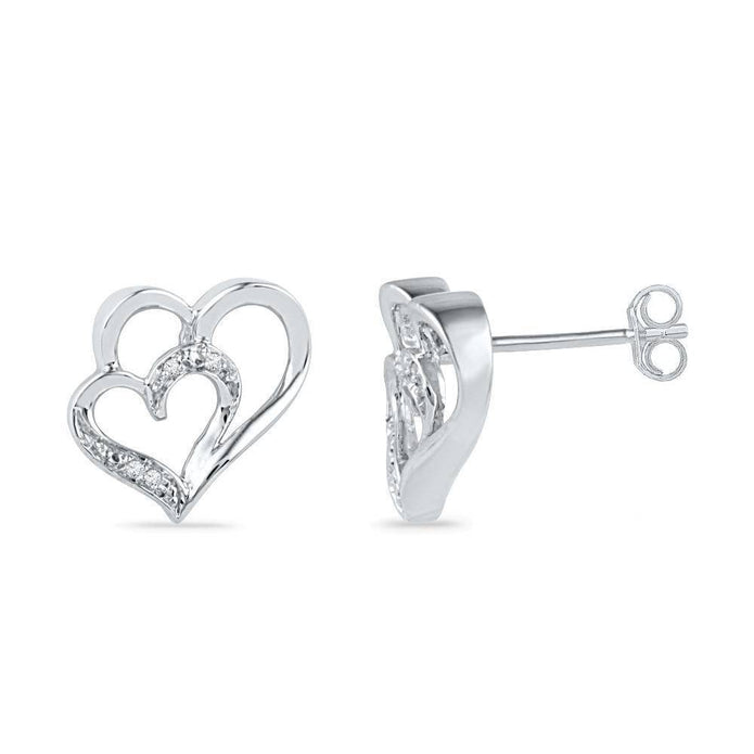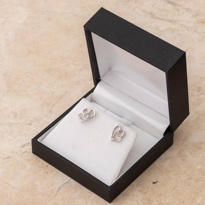 Double Heart Diamond Stud Earrings, Silver or White Gold