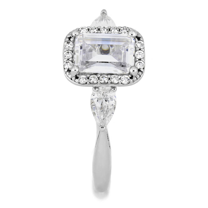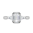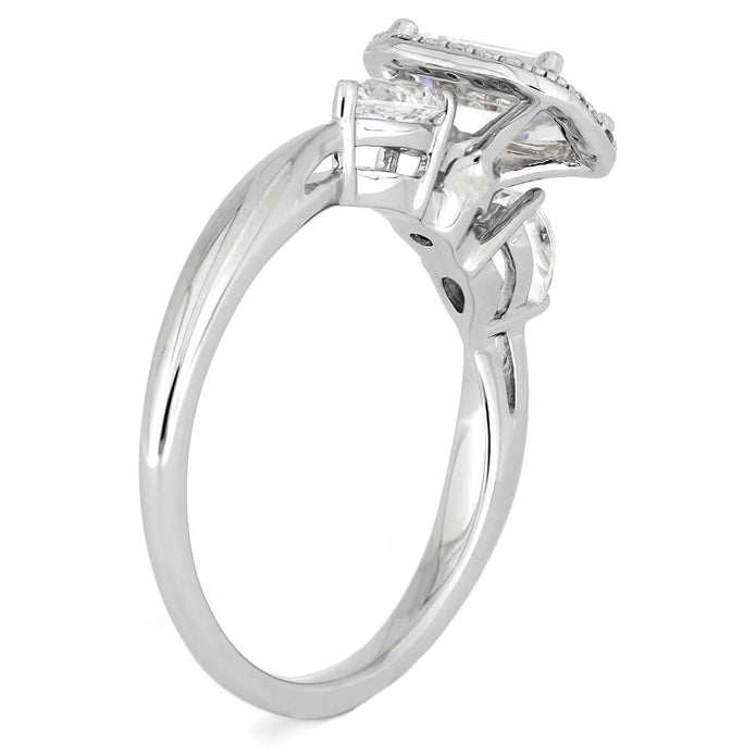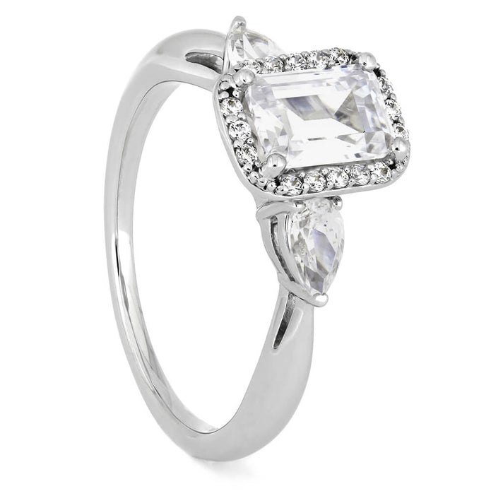 This white gold engagement ring has a gorgeous halo setting with sparkling diamond accents. Its feature stone is an emerald cut moissanite. The accent stones on the shank are pear-shaped diamonds.