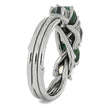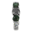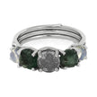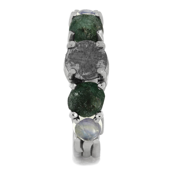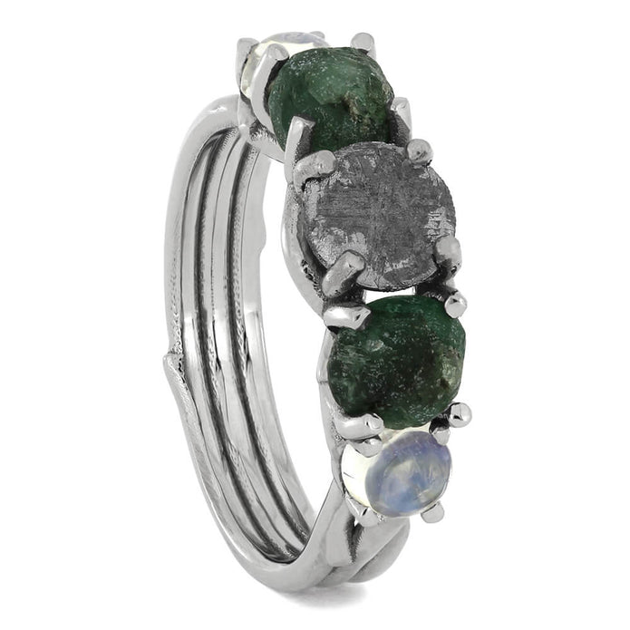 Wear one of the most unique rings there could ever be. This alternative engagement ring is marvelous and is crafted with a mixture of alternative gemstones. The center stone is a round, genuine meteorite. On either side, rough cut emeralds. And, moonstone cabochons round things out near the band.