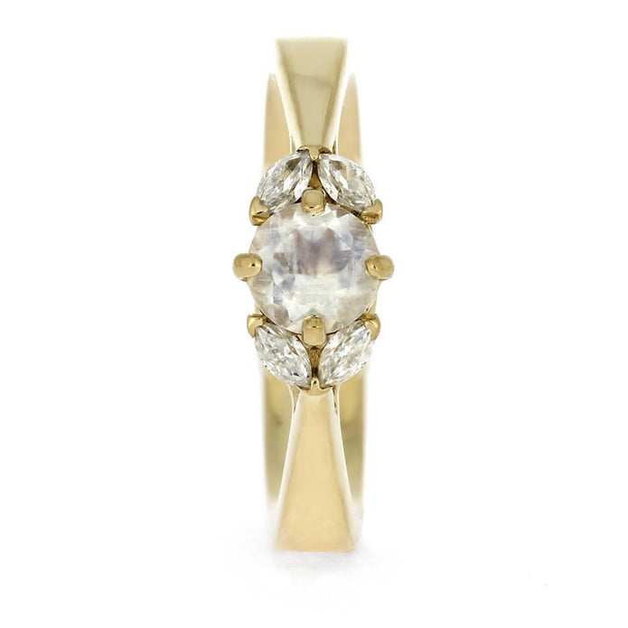 This handmade floral engagement ring features a gorgeous moonstone in a cathedral-style prong setting. Marquise cut Moissanite accent stones provide a symmetrical frame that resembles sparkling leaves.
